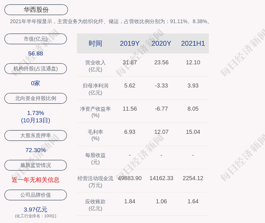 2021年半年报显示,华西股份的主营业务为纺织化纤、储运,占营收比例分别为:91.11%、8.38%。