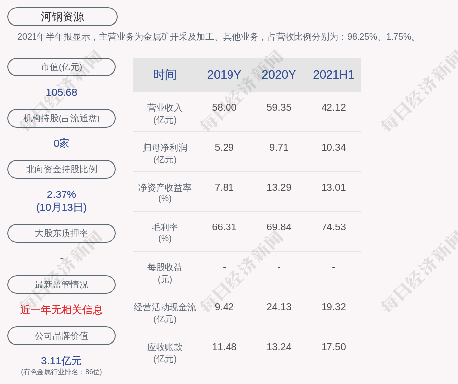 2021年半年报显示,河钢资源的主营业务为金属矿开采及加工、其他业务,占营收比例分别为:98.25%、1.75%。