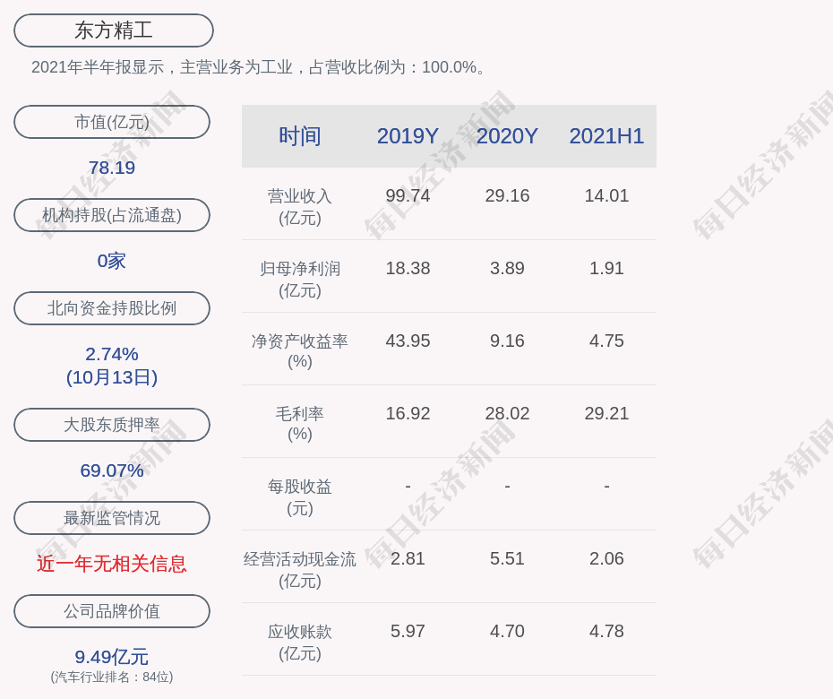 2021年半年报显示,东方精工的主营业务为工业,占营收比例为:100.0%。