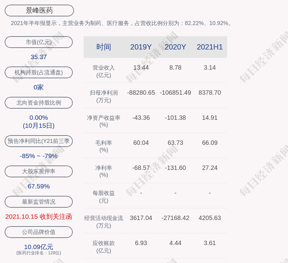 2021年半年报显示,景峰医药的主营业务为制药、医疗服务,占营收比例分别为:82.22%、10.92%。