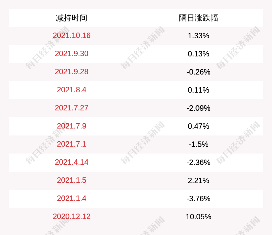 2. 上海洗霸上次发布减持公告是2021年10月16日,第二个交易日上涨1.33%,上海洗霸近一年共发布12次减持类公告。更多关键信息,请搜索“道达号”。