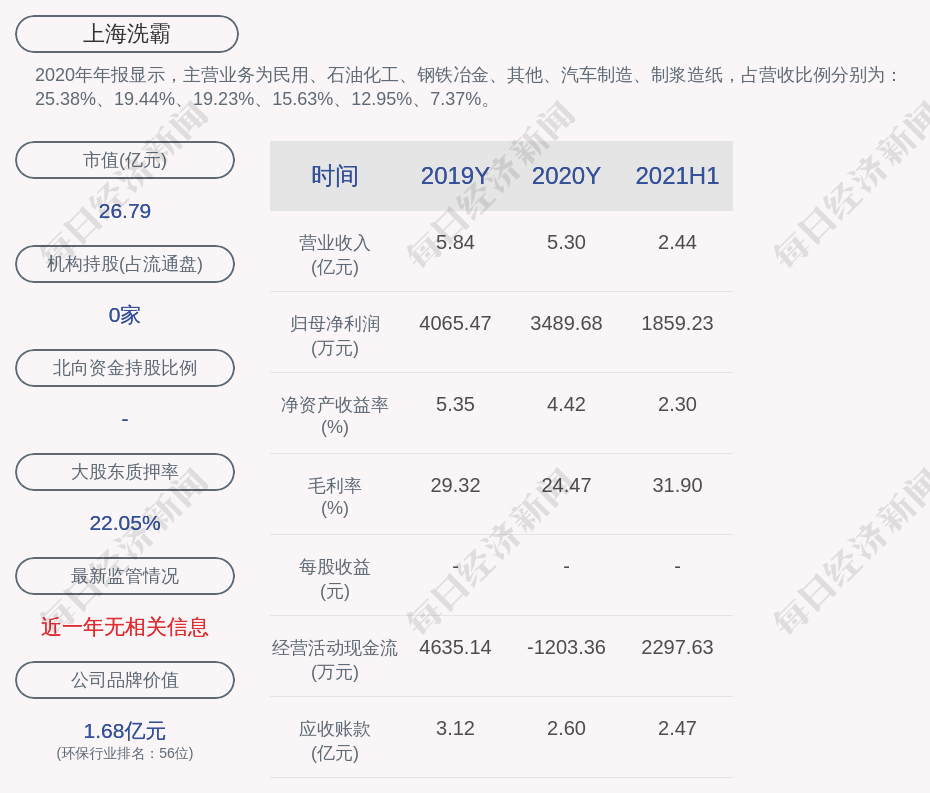 2020年年报显示,上海洗霸的主营业务为民用、石油化工、钢铁冶金、其他、汽车制造、制浆造纸,占营收比例分别为:25.38%、19.44%、19.23%、15.63%、12.95%、7.37%。