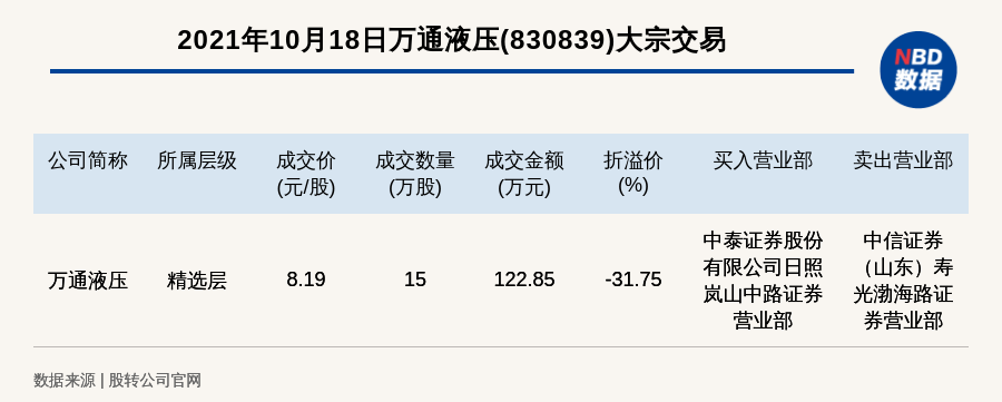 每经AI快讯,2021年10月18日,新三板精选层公司万通液压(830839)发生一笔大宗交易,成交价8.19元/股,成交数量15万股,成交金额122.85万元,折价31.75%。买入营业部是中泰证券股份有限公司日照岚山中路证券营业部,卖出营业部是中信证券(山东)寿光渤海路证券营业部。