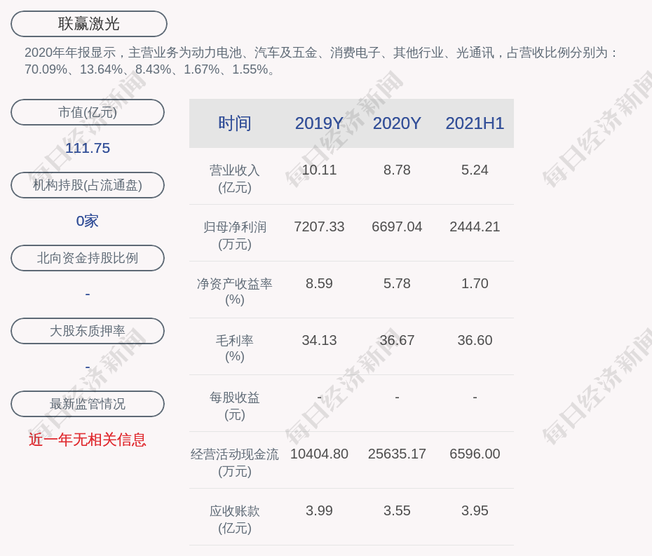 2020年年报显示,联赢激光的主营业务为动力电池、汽车及五金、消费电子、其他行业、光通讯,占营收比例分别为:70.09%、13.64%、8.43%、1.67%、1.55%。