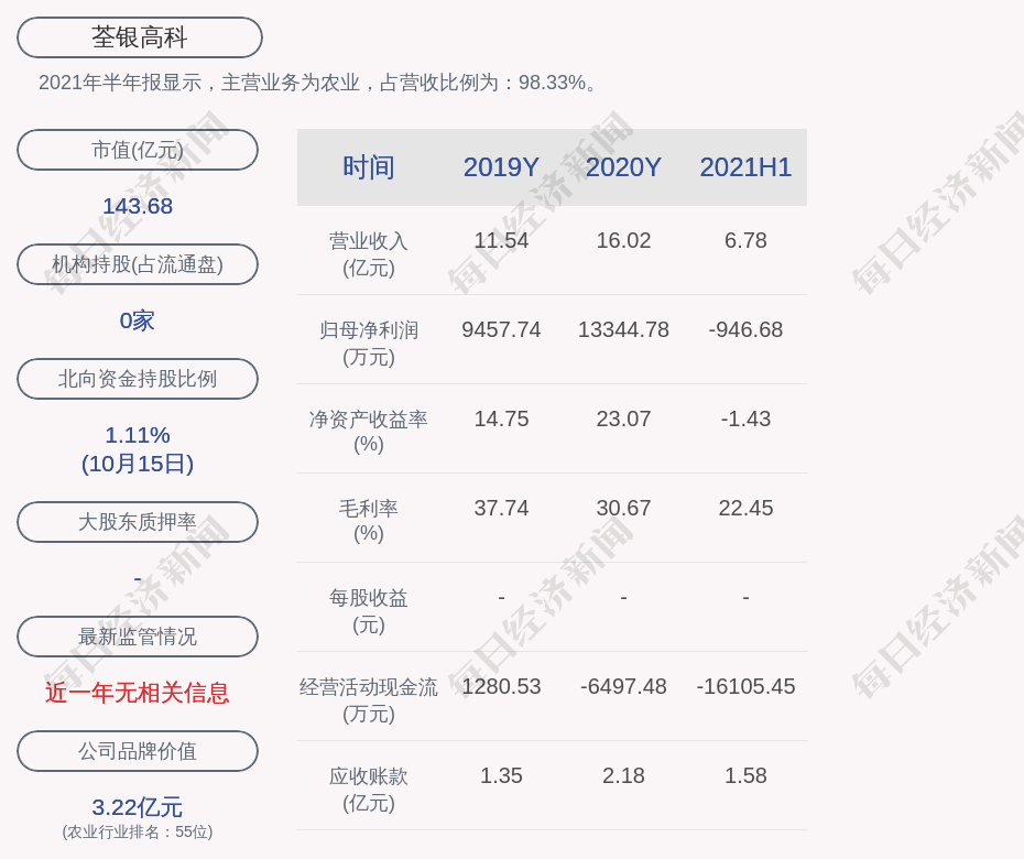 2021年半年报显示,荃银高科的主营业务为农业,占营收比例为:98.33%。