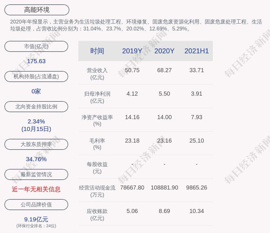 2020年年报显示,高能环境的主营业务为生活垃圾处理工程、环境修复、固废危废资源化利用、固废危废处理工程、生活垃圾处理,占营收比例分别为:31.04%、23.7%、20.02%、12.69%、5.29%。