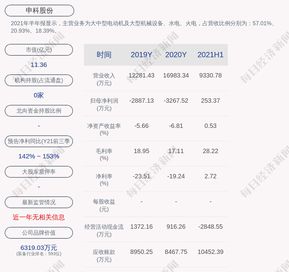 2021年半年报显示,申科股份的主营业务为大中型电动机及大型机械设备、水电、火电,占营收比例分别为:57.01%、20.93%、18.39%。