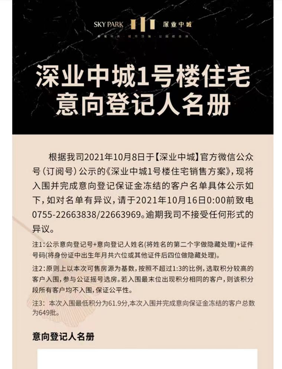 随后,深业中城的公布了认筹名单,共计649人登记认筹并冻结诚意金,最低入围积分为61.9分。按照500万元/套的保证金,至少冻结了32.4亿元资金,中签率约34.2%。(证券时报)