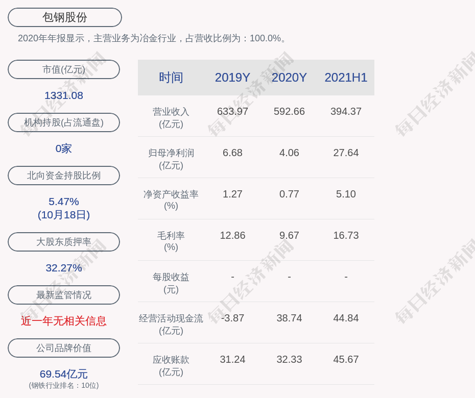 2020年年报显示,包钢股份的主营业务为冶金行业,占营收比例为:100.0%。