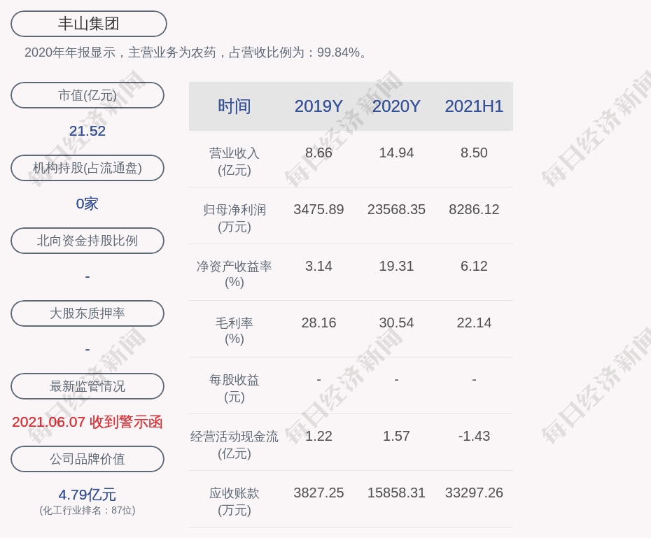 2020年年报显示,丰山集团的主营业务为农药,占营收比例为:99.84%。