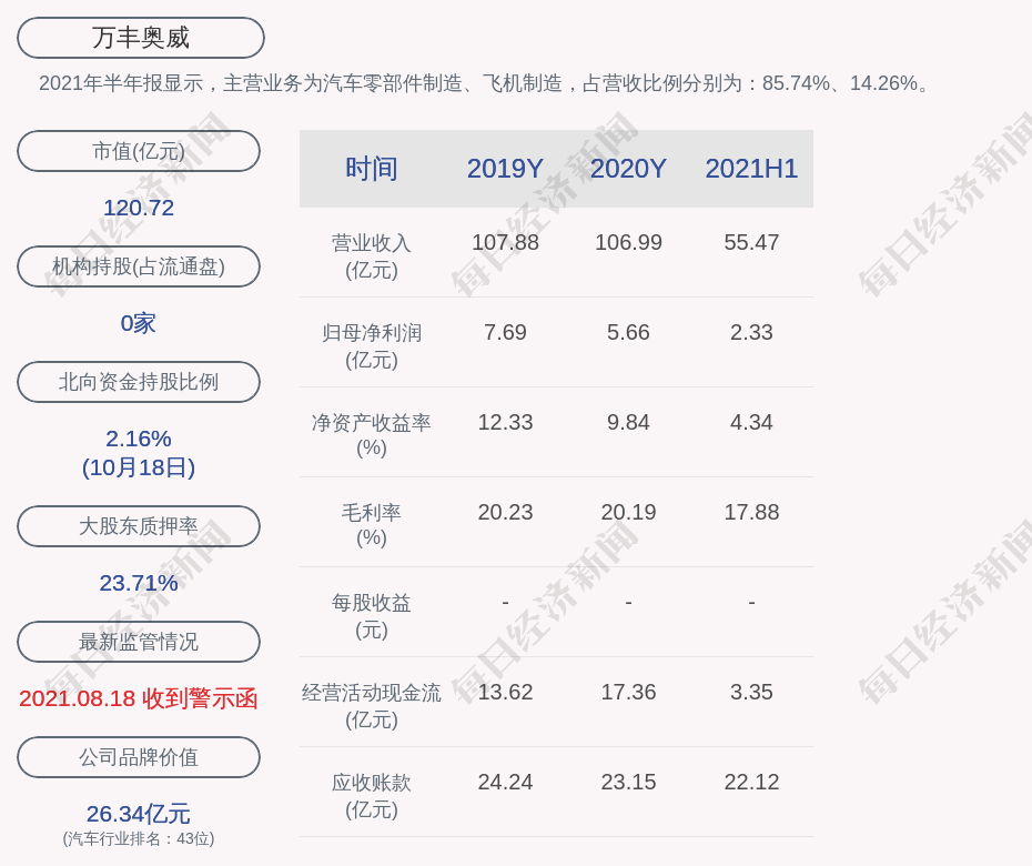 2021年半年报显示,万丰奥威的主营业务为汽车零部件制造、飞机制造,占营收比例分别为:85.74%、14.26%。