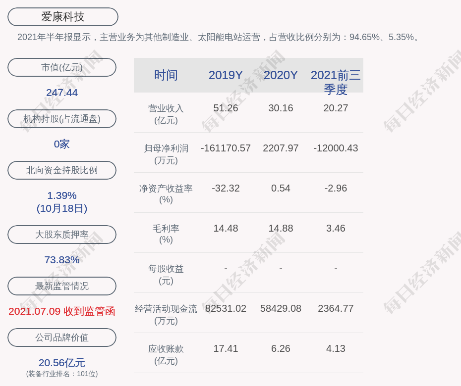 2021年半年报显示,爱康科技的主营业务为其他制造业、太阳能电站运营,占营收比例分别为:94.65%、5.35%。
