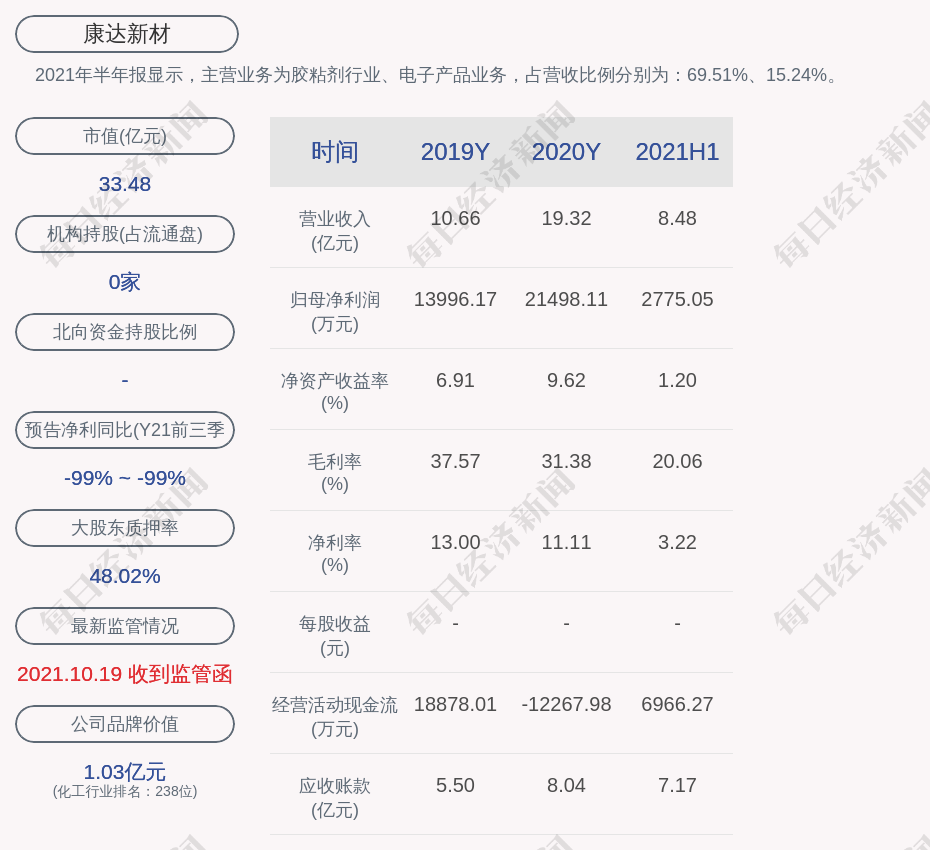 2021年半年报显示,康达新材的主营业务为胶粘剂行业、电子产品业务,占营收比例分别为:69.51%、15.24%。
