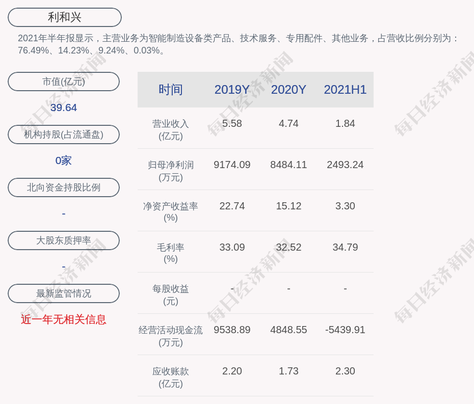 2021年半年报显示,利和兴的主营业务为智能制造设备类产品、技术服务、专用配件、其他业务,占营收比例分别为:76.49%、14.23%、9.24%、0.03%。