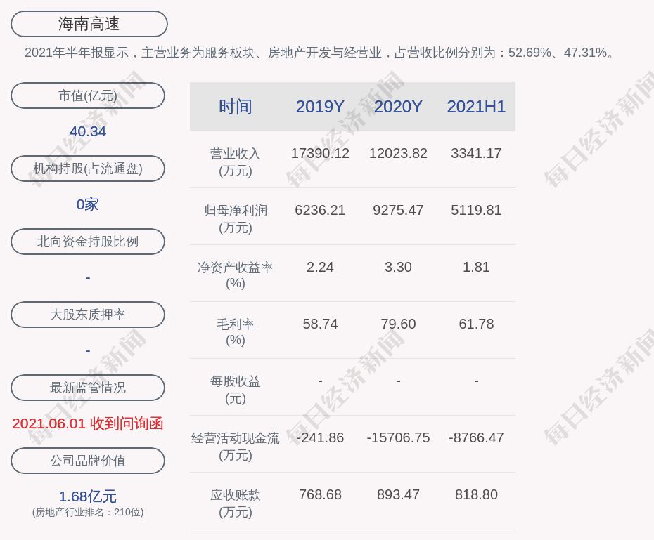 2021年半年报显示,海南高速的主营业务为服务板块、房地产开发与经营业,占营收比例分别为:52.69%、47.31%。