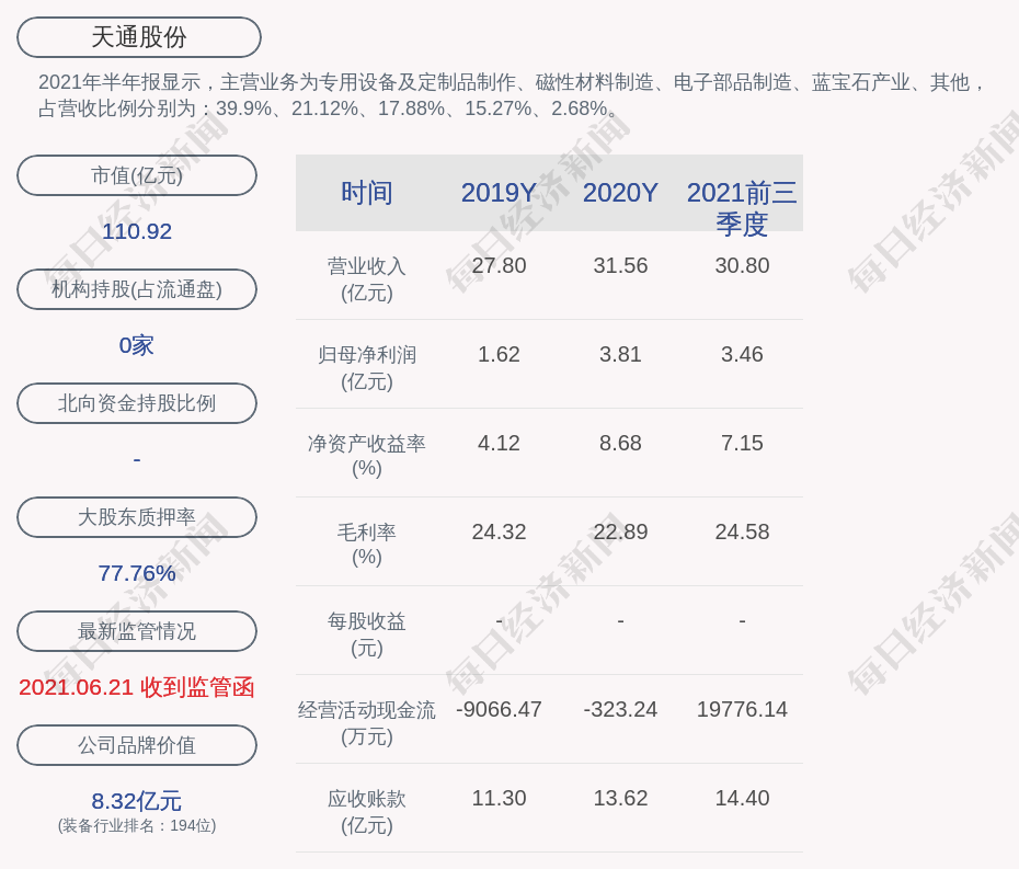 2021年半年报显示,天通股份的主营业务为专用设备及定制品制作、磁性材料制造、电子部品制造、蓝宝石产业、其他,占营收比例分别为:39.9%、21.12%、17.88%、15.27%、2.68%。