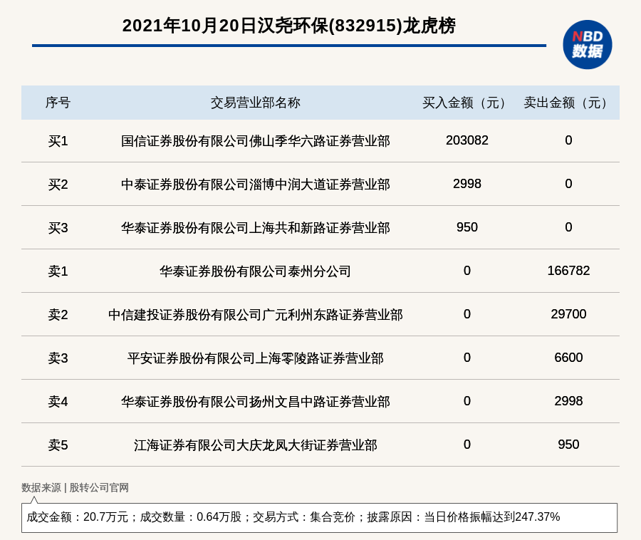 每经AI快讯,2021年10月20日,汉尧环保(832915)登上龙虎榜,交易方式是集合竞价,披露原因是当日价格振幅达到247.37%,成交数量0.64万股,成交金额20.7万元。买一席位为国信证券股份有限公司佛山季华六路证券营业部,买入20.31万元;卖一席位为华泰证券股份有限公司泰州分公司,卖出16.68万元。