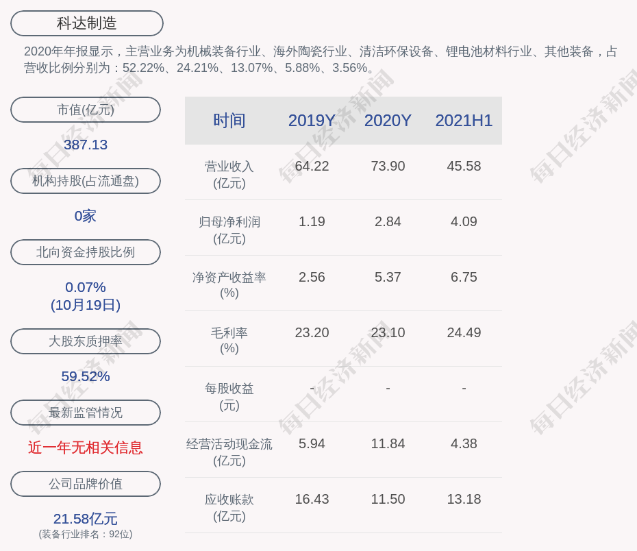 2020年年报显示,科达制造的主营业务为机械装备行业、海外陶瓷行业、清洁环保设备、锂电池材料行业、其他装备,占营收比例分别为:52.22%、24.21%、13.07%、5.88%、3.56%。