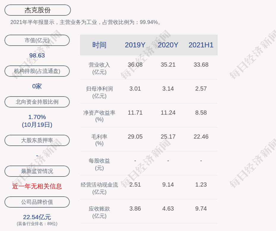 2021年半年报显示,杰克股份的主营业务为工业,占营收比例为:99.94%。