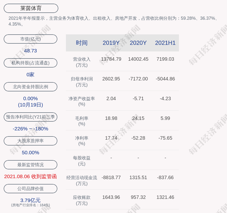2021年半年报显示,莱茵体育的主营业务为体育收入、出租收入、房地产开发,占营收比例分别为:59.28%、36.37%、4.35%。