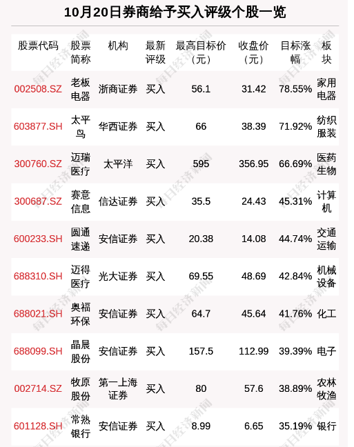 3丨整点投资 | 10月20日48只个股获券商关注,老板电器目标涨幅达78.55%