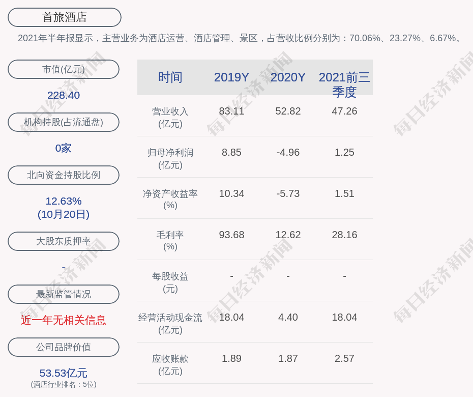 2021年半年报显示,首旅酒店的主营业务为酒店运营、酒店管理、景区,占营收比例分别为:70.06%、23.27%、6.67%。