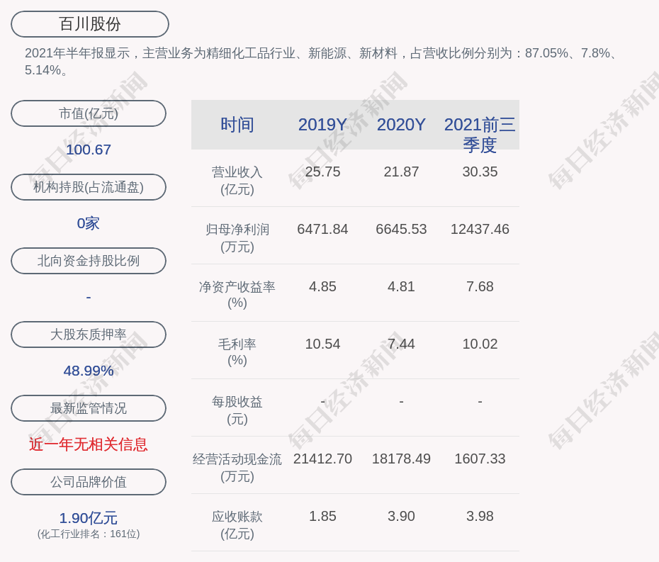 2021年半年报显示,百川股份的主营业务为精细化工品行业、新能源、新材料,占营收比例分别为:87.05%、7.8%、5.14%。