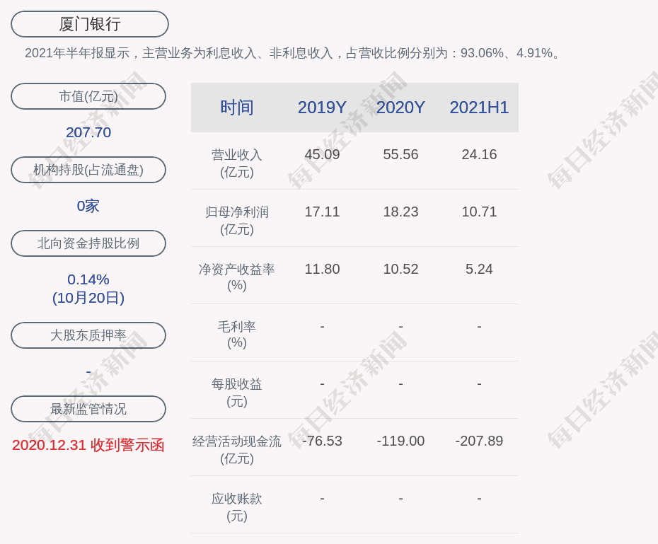 2021年半年报显示,厦门银行的主营业务为利息收入、非利息收入,占营收比例分别为:93.06%、4.91%。