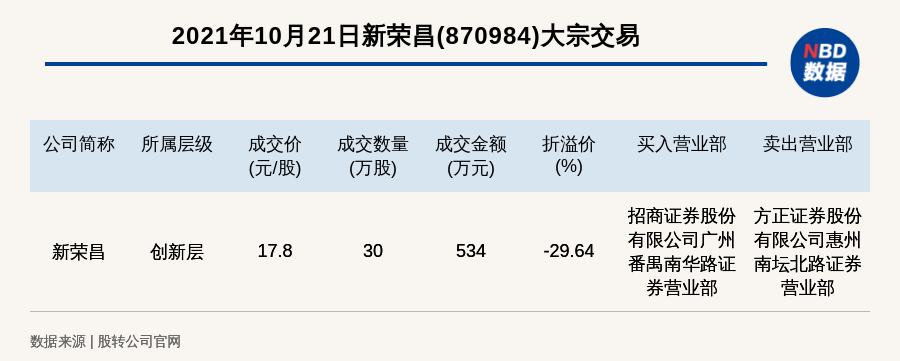 每经AI快讯,2021年10月21日,新三板创新层公司新荣昌(870984)发生一笔大宗交易,成交价17.8元/股,成交数量30万股,成交金额534万元,折价29.64%。买入营业部是招商证券股份有限公司广州番禺南华路证券营业部,卖出营业部是方正证券股份有限公司惠州南坛北路证券营业部。