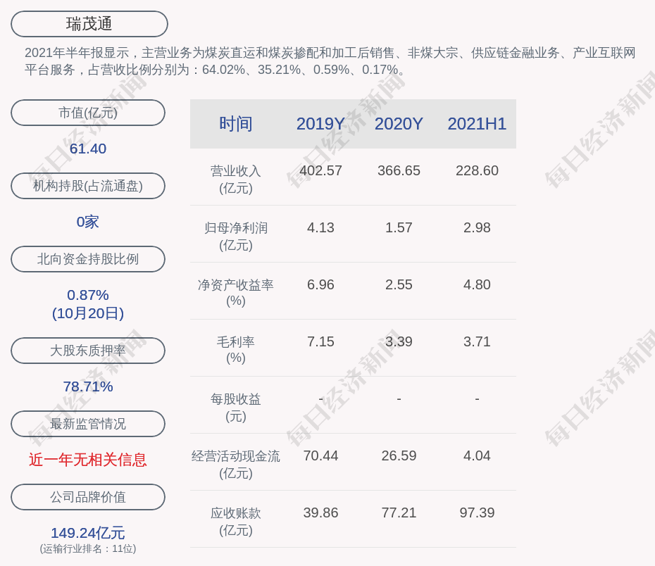 2021年半年报显示,瑞茂通的主营业务为煤炭直运和煤炭掺配和加工后销售、非煤大宗、供应链金融业务、产业互联网平台服务,占营收比例分别为:64.02%、35.21%、0.59%、0.17%。