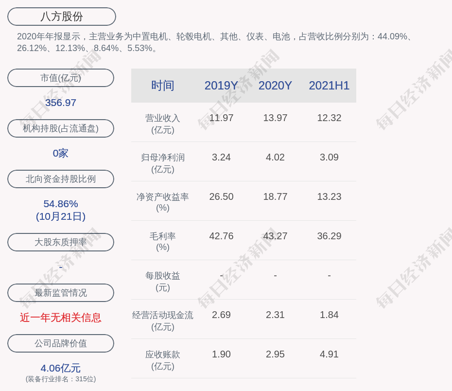 2020年年报显示,八方股份的主营业务为中置电机、轮毂电机、其他、仪表、电池,占营收比例分别为:44.09%、26.12%、12.13%、8.64%、5.53%。