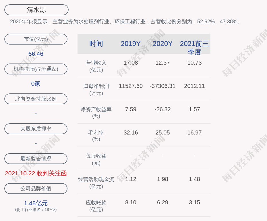 2020年年报显示,清水源的主营业务为水处理剂行业、环保工程行业,占营收比例分别为:52.62%、47.38%。