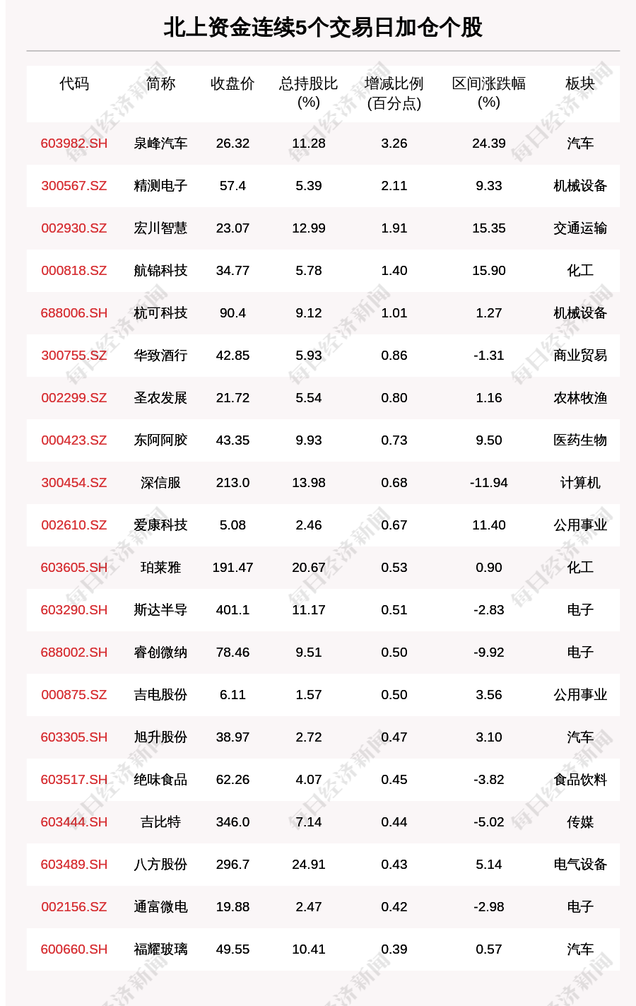 每经AI快讯,10月22日,北上资金连续5个交易日买入67个股。北上资金连续5个交易日加仓个股中,泉峰汽车(603982.SH,收盘价:26.32元)增持比例增幅最大,5个交易日增持3.26个百分点,其他增持比例较大的个股包括精测电子(300567.SZ,收盘价:57.4元)、宏川智慧(002930.SZ,收盘价:23.07元)、航锦科技(000818.SZ,收盘价:34.77元),分别增持2.11个百分点、1.91个百分点、1.40个百分点。