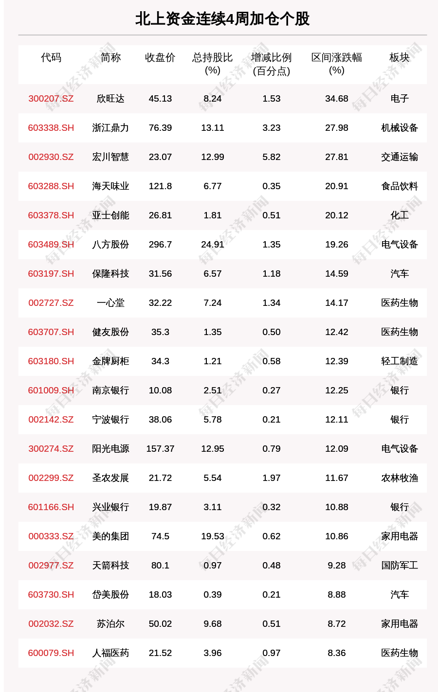 北上资金连续4周买入93个股,其中银行行业的个股最多,有13只。从市场表现来看,北上资金连续4周的加仓个股中,本周57只个股股价上涨,其中欣旺达(300207.SZ,收盘价:45.13元)涨幅最大,上涨34.68%,其他涨幅较大的个股包括浙江鼎力(603338.SH,收盘价:76.39元)、宏川智慧(002930.SZ,收盘价:23.07元)、海天味业(603288.SH,收盘价:121.8元)。