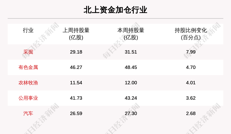 本周北上资金加仓的行业共有13个。其中,采掘行业加仓最明显,北上资金持股数环比增加7.99%。其他北上资金加仓较多的行业还包括有色金属、农林牧渔、公用事业。