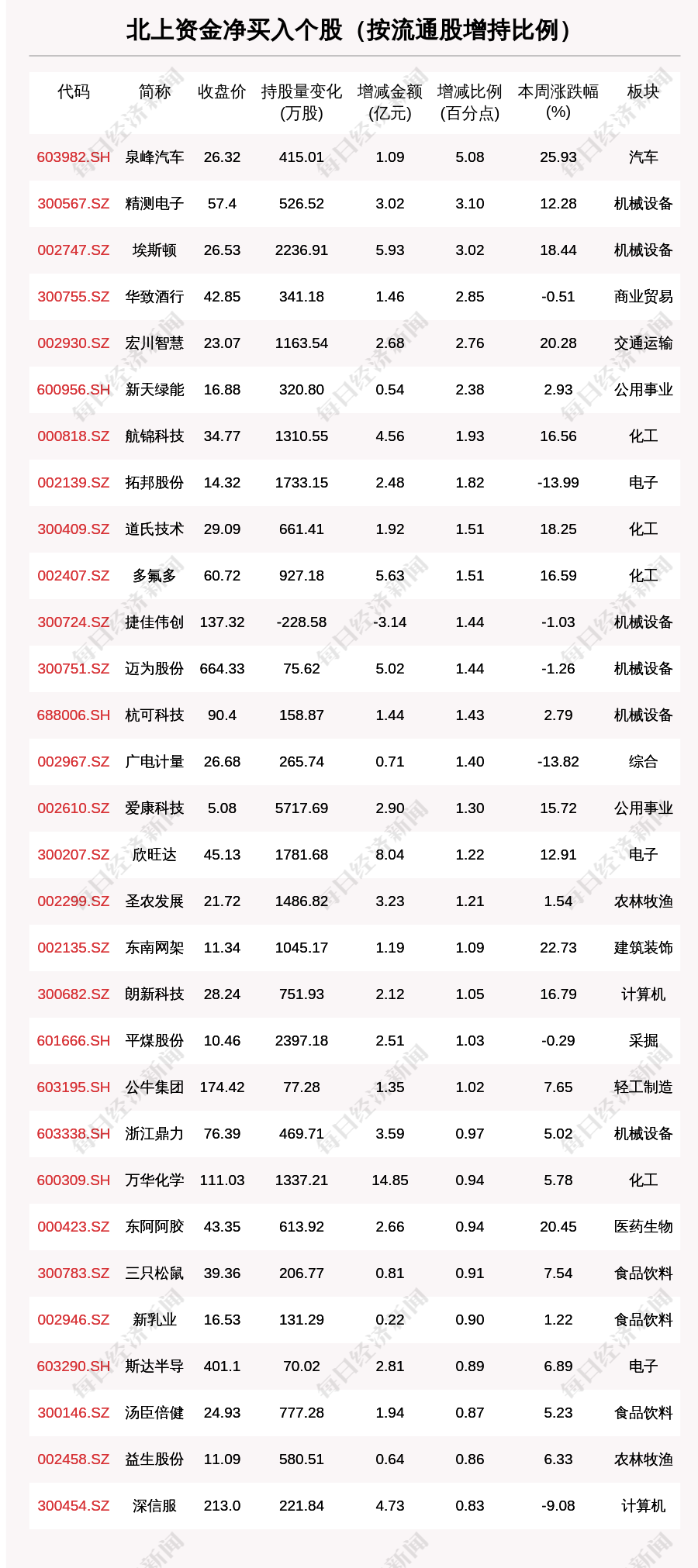 本周北上资金净买入个股共有708只,北上资金加仓比例超1%的有647只。其中,泉峰汽车(603982.SH,收盘价:26.32元)加仓比例最为明显,最新持股比例12.86%,环比增加5.79个百分点。其他北上资金加仓比例较多的个股还包括精测电子(300567.SZ,收盘价:57.4元)、埃斯顿(002747.SZ,收盘价:26.53元)、华致酒行(300755.SZ,收盘价:42.85元)。