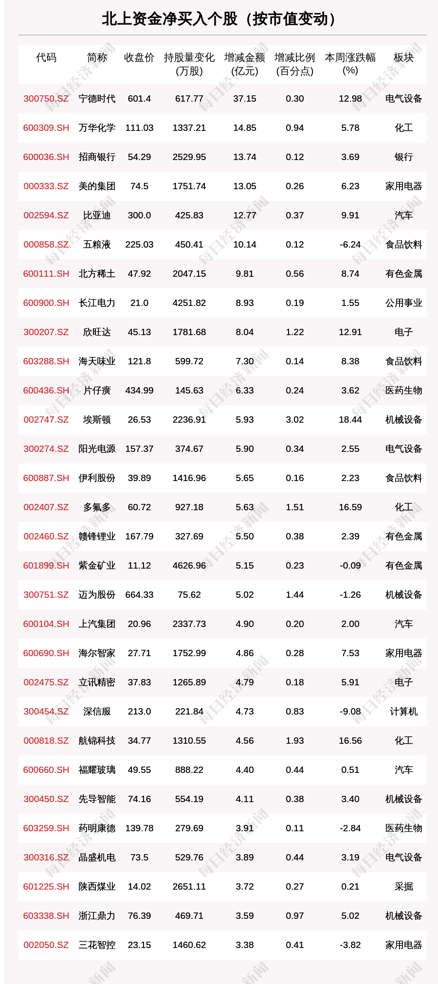 按照北向资金增持市值排序,宁德时代(300750.SZ,收盘价:601.4元)增持市值最大,增持市值37.153亿元,环比增加3.88%。其他北上资金增持市值较多的个股还包括万华化学(600309.SH,收盘价:111.03元)、招商银行(600036.SH,收盘价:54.29元)、美的集团(000333.SZ,收盘价:74.5元)。
