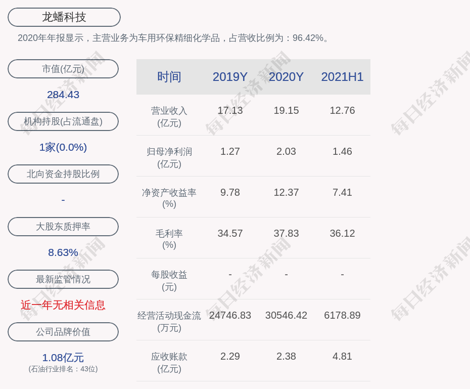 2020年年报显示,龙蟠科技的主营业务为车用环保精细化学品,占营收比例为:96.42%。