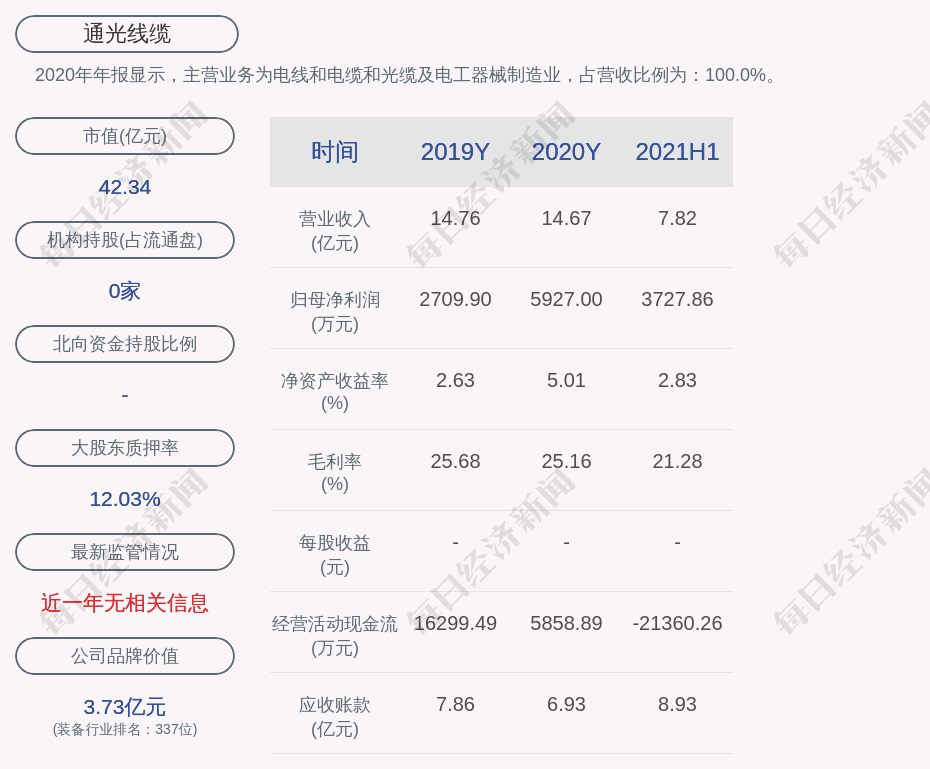 2020年年报显示,通光线缆的主营业务为电线和电缆和光缆及电工器械制造业,占营收比例为:100.0%。
