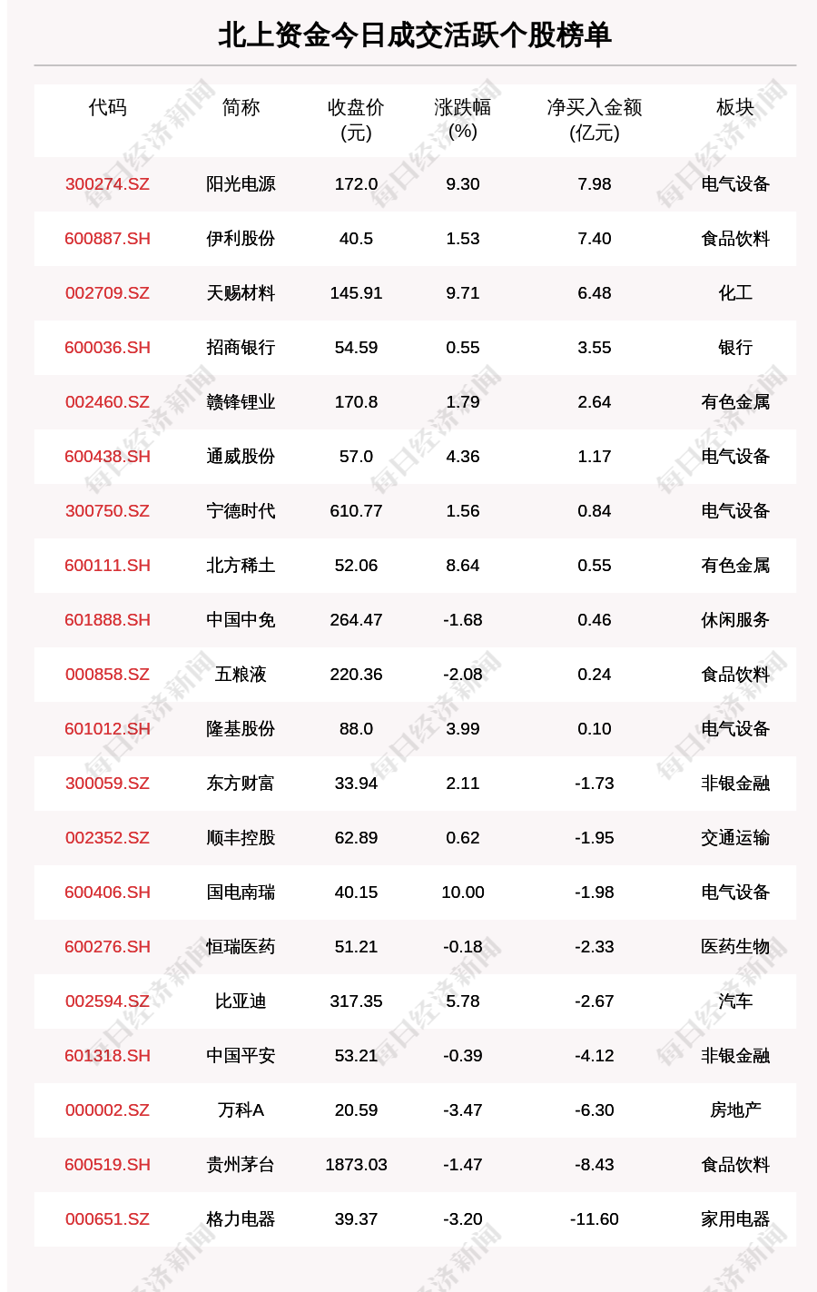 10月25日,北上资金成交活跃个股榜单中,净买入个股共11只,金额最多的是阳光电源(300274.SZ,收盘价:172.0元),净买入7.977亿元;净卖出个股共9只,金额最多的是格力电器(000651.SZ,收盘价:39.37元),净卖出11.596亿元。