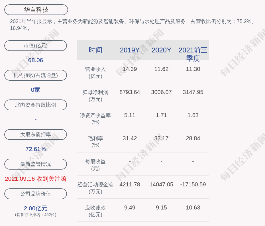 2021年半年报显示,华自科技的主营业务为新能源及智能装备、环保与水处理产品及服务,占营收比例分别为:75.2%、16.94%。