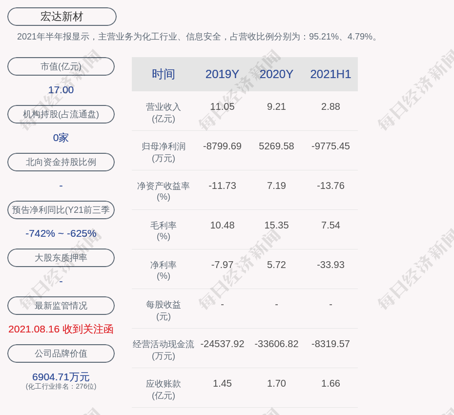 2021年半年报显示,宏达新材的主营业务为化工行业、信息安全,占营收比例分别为:95.21%、4.79%。