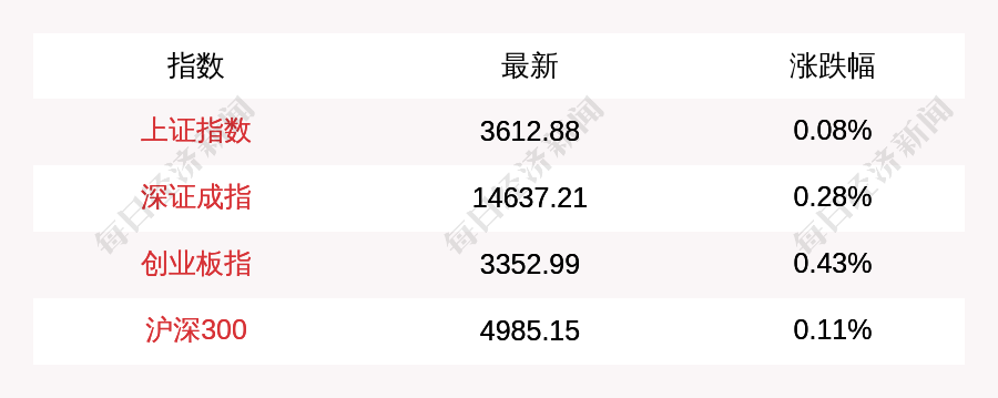每经AI快讯:北京时间10月26日11:30,上证指数早盘上涨3.02点,涨幅为0.08%,报收3612.88点,成交额3050.92亿元;深证成指上涨40.49点,涨幅为0.28%,报收14637.21点,成交额4084.21亿元;创业板指上涨14.37点,涨幅为0.43%,报收3352.99点,成交额1534.18亿元;沪深300上涨5.63点,涨幅为0.11%,报收4985.15点,成交额1960.87亿元。