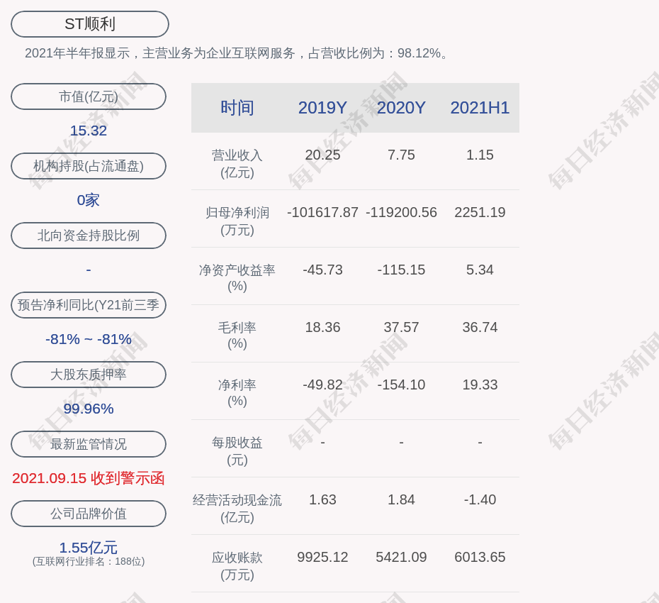 2021年半年报显示,ST顺利的主营业务为企业互联网服务,占营收比例为:98.12%。
