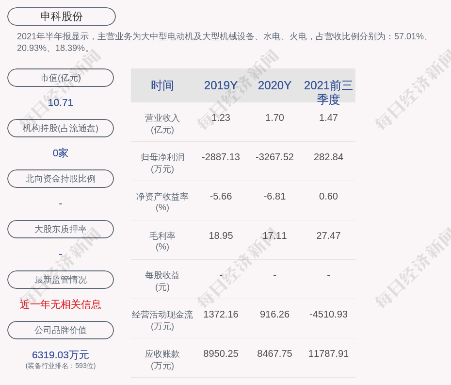 2021年半年报显示,申科股份的主营业务为大中型电动机及大型机械设备、水电、火电,占营收比例分别为:57.01%、20.93%、18.39%。
