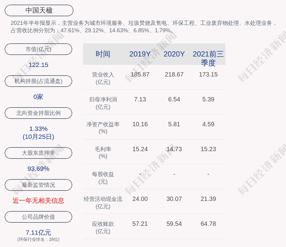2021年半年报显示,中国天楹的主营业务为城市环境服务、垃圾焚烧及售电、环保工程、工业废弃物处理、水处理业务,占营收比例分别为:47.61%、29.12%、14.63%、6.85%、1.79%。