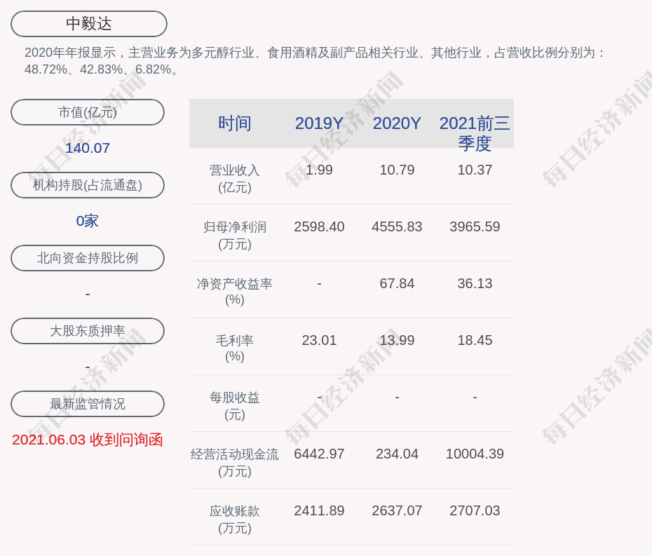 2020年年报显示,中毅达的主营业务为多元醇行业、食用酒精及副产品相关行业、其他行业,占营收比例分别为:48.72%、42.83%、6.82%。