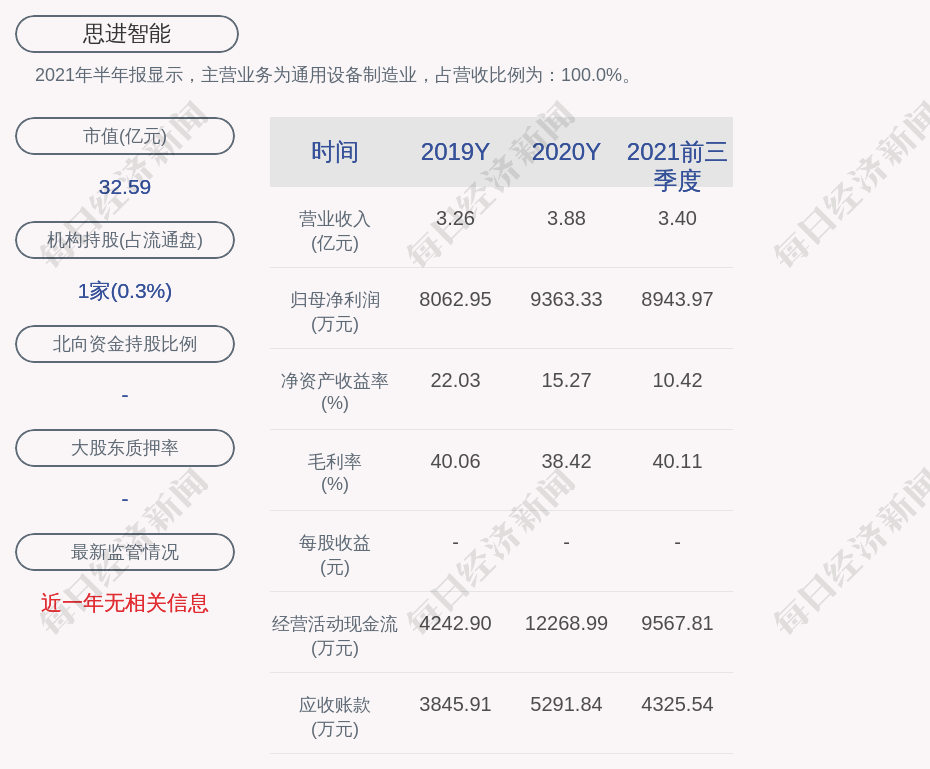 2021年半年报显示,思进智能的主营业务为通用设备制造业,占营收比例为:100.0%。
