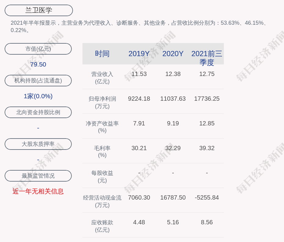 2021年半年报显示,兰卫医学的主营业务为代理收入、诊断服务、其他业务,占营收比例分别为:53.63%、46.15%、0.22%。