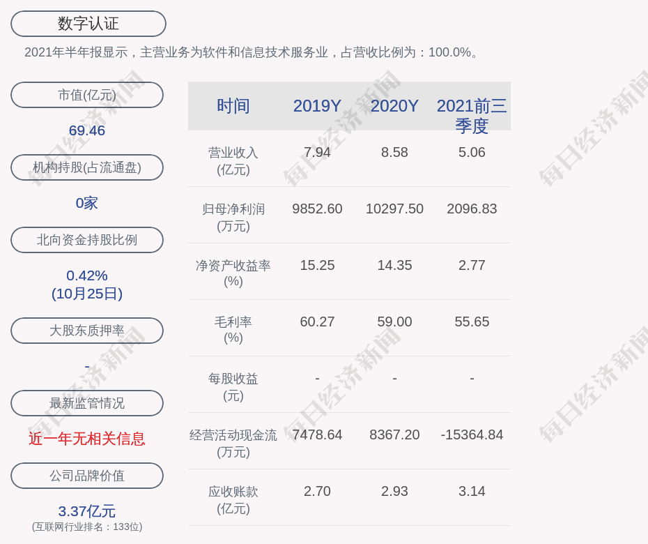 2021年半年报显示,数字认证的主营业务为软件和信息技术服务业,占营收比例为:100.0%。